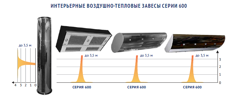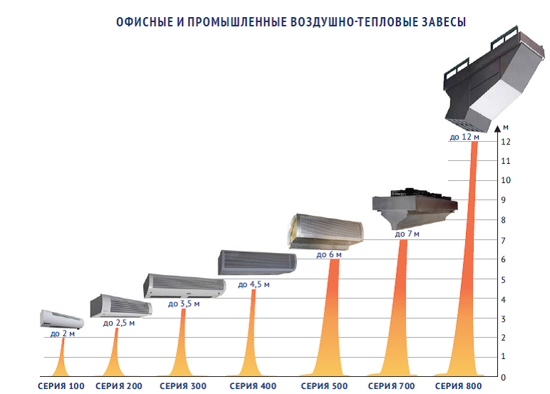 В соответствии с имеющейся номенклатурой, все завесы представлены по сериям от 100 до 800. Увеличение серии от 100 до 800 отражает качественное усиление заградительного эффекта завесы, связанного с удельным расходом воздуха на 1 метр длины завесы.
